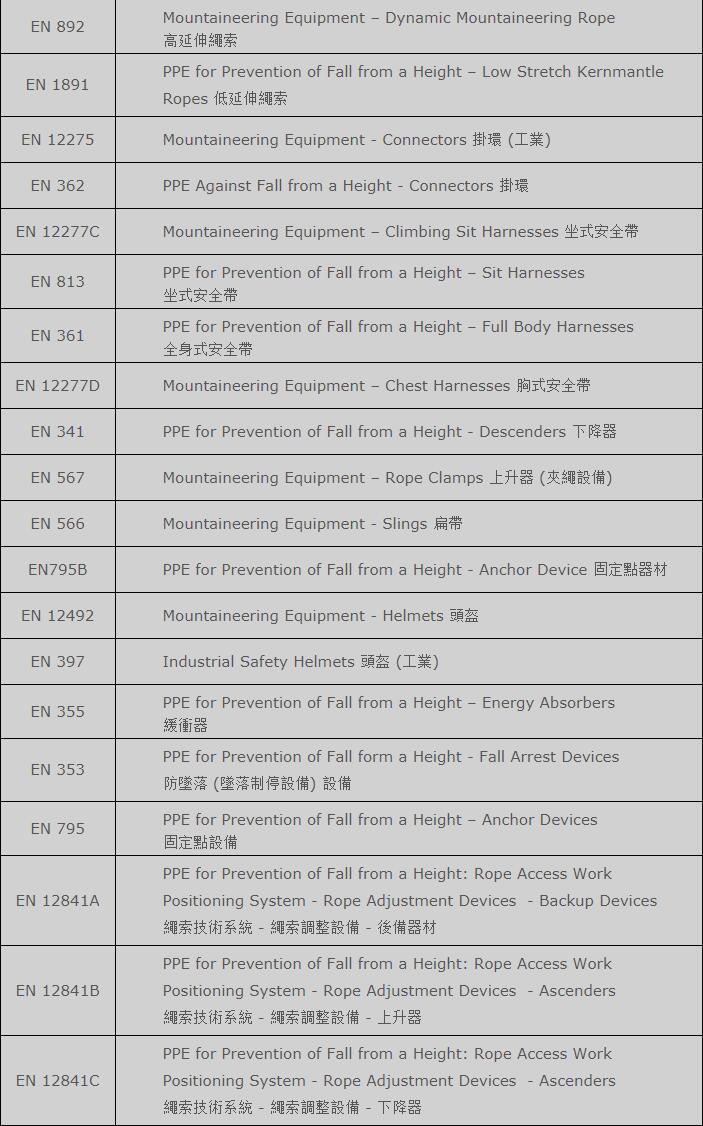 歐盟指引89/686/EEC中不同器材種類的參考編號(hào) (即EN編號(hào))