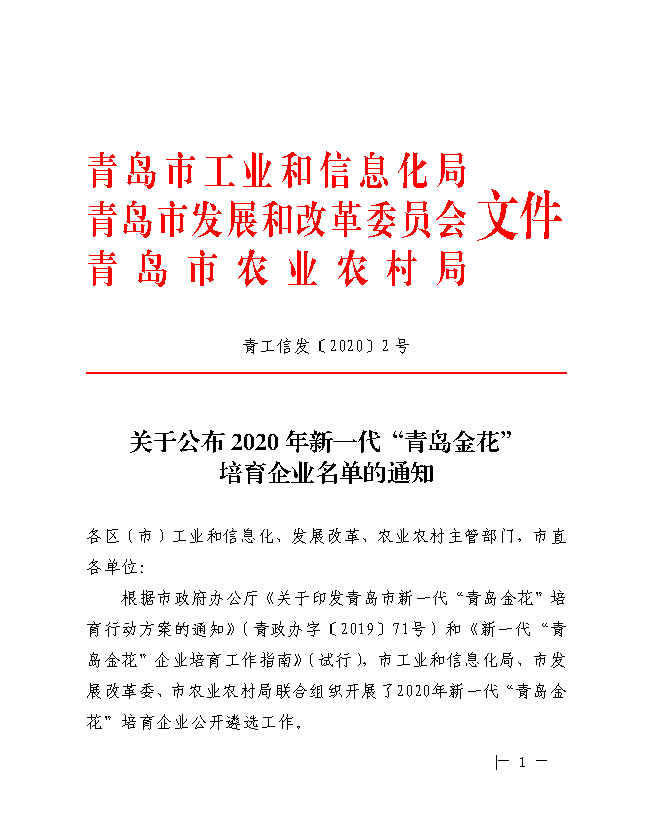 根據市政府辦公廳《關于印發(fā)青島市新一代“青島金花”培育行動方案的通知》〔青政辦字〔2019〕71號)和《新一代“青島金花”企業(yè)培育工作指南》〔試行,市工業(yè)和信息化局、市發(fā)展改革委、市農業(yè)農村局聯(lián)合組織開展了2020年新一代“青島金花”培育企業(yè)公開—選工作。