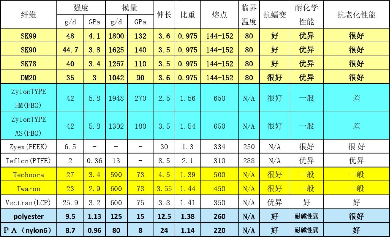 1、國(guó)外繩纜企業(yè)使用的HMPE纖維的性能指標(biāo)