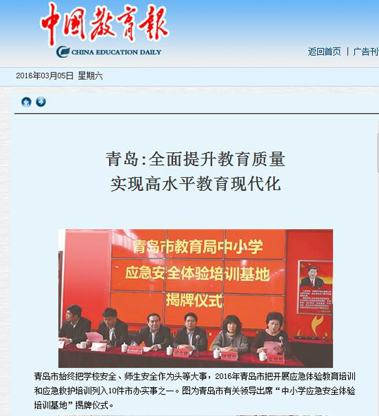 2016年青島市把開展中小學(xué)生應(yīng)急體驗教育培訓(xùn)和市民應(yīng)急救護培訓(xùn)列入10件市辦實事,未來海麗雅應(yīng)急安全教育培訓(xùn)中心將為更多的學(xué)生、百姓提供專業(yè)化應(yīng)急安全教育培訓(xùn)服務(wù),為提升社會整體應(yīng)急自救、互救技能水平貢獻力量?!吨袊逃龍蟆逢P(guān)注青島市應(yīng)急教育的發(fā)展,在全國“兩會”期間,第一時間將“青島市教育局中小學(xué)應(yīng)急安全體驗培訓(xùn)基地”落戶海麗雅應(yīng)急安全教育培訓(xùn)中心消息進行宣傳報道。
