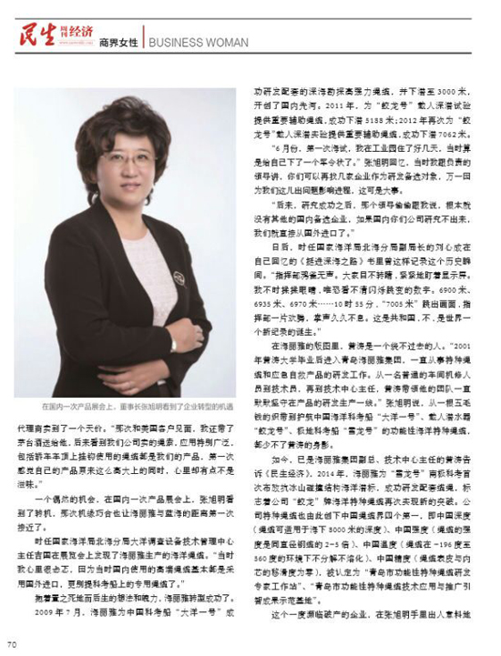 2016年3月,人民日報《民生周刊》增設(shè)了“商界女性”專欄。經(jīng)過中國女企業(yè)家協(xié)會推薦,海麗雅集團董事長張旭明成為該專欄首位中國女企業(yè)家。期刊在全國“兩會”期間向公眾呈現(xiàn)百年企業(yè)的傳奇發(fā)展歷程。