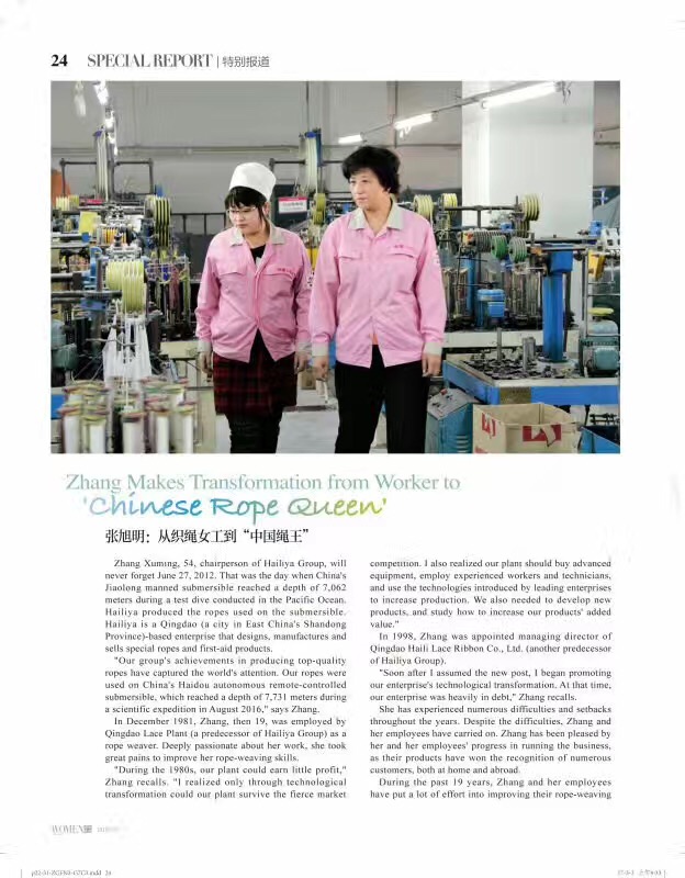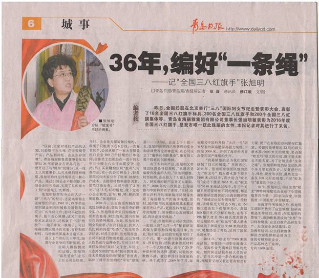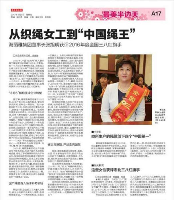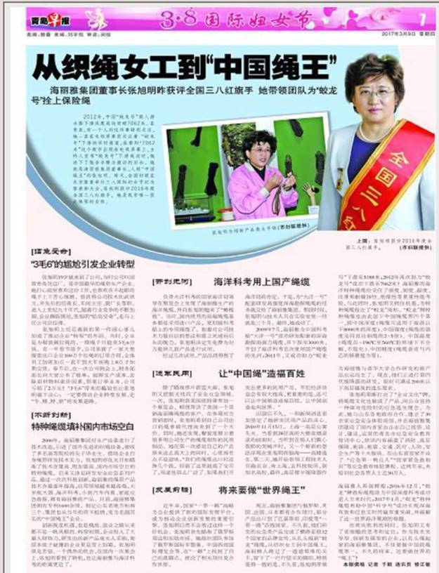 “業(yè)精于勤,荒于嬉;行成于思,毀于隨”,用在張旭明身上最貼切。36年的光陰,張旭明毫不吝嗇的奉獻(xiàn)給海麗雅,從織繩女工到“中國繩王”,這背后砥礪前行的痛楚也只有她自己最清楚。但是,路漫漫其修遠(yuǎn)兮,張旭明會(huì)一直秉持“大國匠心”的理念,將繩纜產(chǎn)業(yè)做到極致,要讓自己的繩纜走出國門,站在世界的舞臺(tái)上,為國爭光!