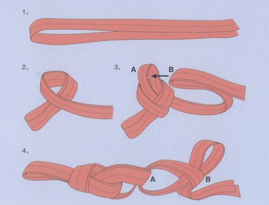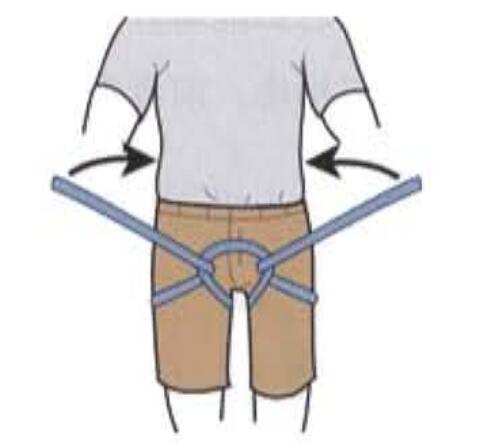 由于最開始距織帶中心的長度被抵消了一部分,織帶兩端應(yīng)該剛好能在您臀部的一側(cè)會合。用平結(jié)(square knot)將織帶的兩端系在一起,以便安全吊帶盡可能的繃