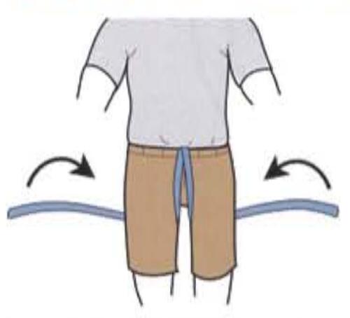 把織帶的兩端向外拉,然后纏到身后。用力拉緊吊帶以便簡易安全吊帶在懸吊時更舒適。將剩余的織帶纏在身上,纏完為止。