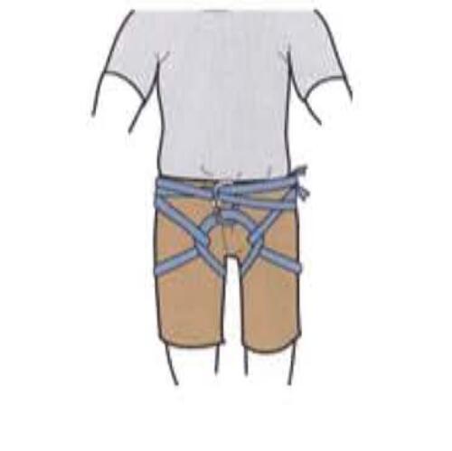 織帶向后穿過兩腿中間,沿兩腿外側(cè)繞到前方。將吊帶的兩端分別穿過別在褲腰上的那個繩環(huán)。