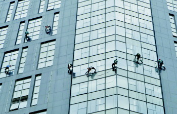 1日下午3點,濟南恒隆廣場的外墻上,有兩個系著安全繩索的人懸在幾十米高的空中,清洗著廣場的玻璃外墻,引起過往路人駐足觀看。