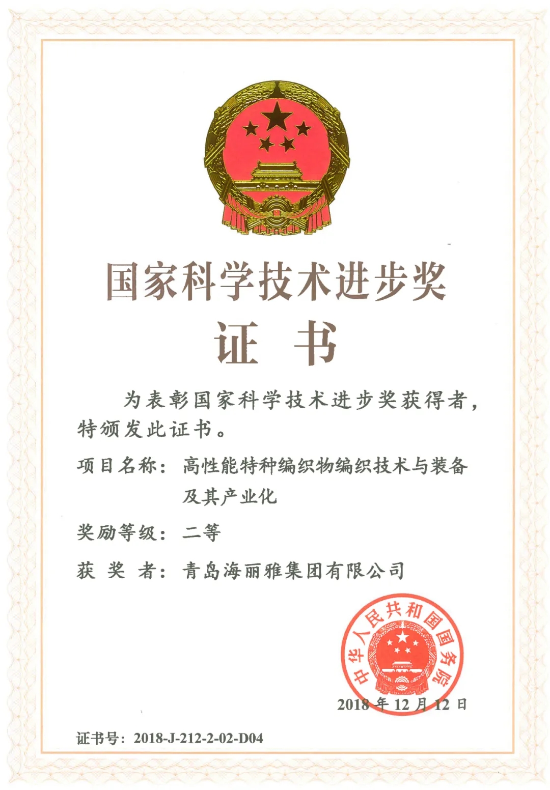 青島海麗雅集團“高性能特種編織物編織技術” 斬獲國家科技進步獎二等獎。