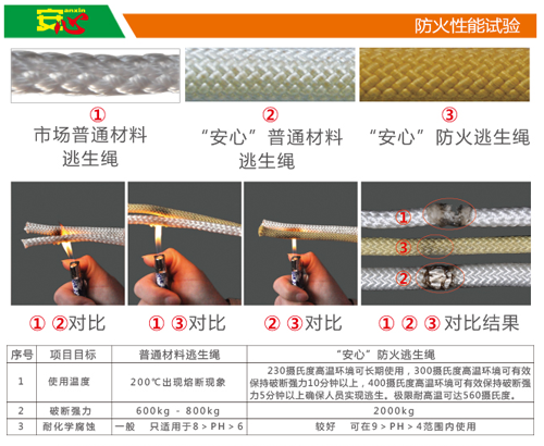“安心”牌防火逃生繩230℃高溫條件下可長期使用,560℃條件下可有效使用10分鐘,破斷力達2000kg,火災現(xiàn)場能夠確保一家三口進行有效逃生。
