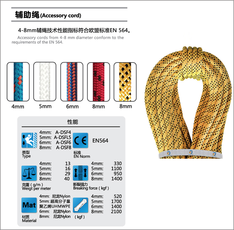 4-8mm各類輔助用繩,斷裂強力2.6KN-12KN。采用雙編織工藝以及先進后整理技術,更加靈活的打結性能,使操作更加靈活自如,豐富多彩的色彩搭配滿足不同客戶需求。